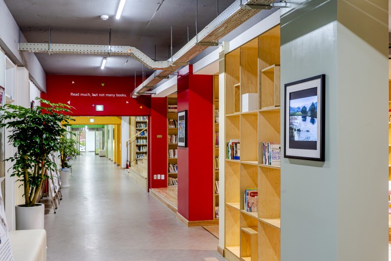 중앙 서가는 기존의 로비 공간을 새롭게 리모델링한 공간으로 증축된 스탠드형 계단을 기본으로 하고 있다. 계단을 통해 학생들은 도서관으로 쉽게 접근할 수 있게 된다. 1층과 2층의 연계, 그리고 외부와 내부공간을 연계해주는 주요한 공간으로 변한다.